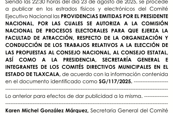 Según la cédula firmada por la secretaria general del CEN, Karen Michel González Márquez, con base en el contenido del documento SG/117/2025, entre julio y agosto renunciaron Cecilia Salas como presidenta de la Comisión Estatal de Procesos Electorales, así como Saulo Tlilayatzi, como integrante, quedando solo Iván Teomitzi como único activo dentro de ese órgano.
