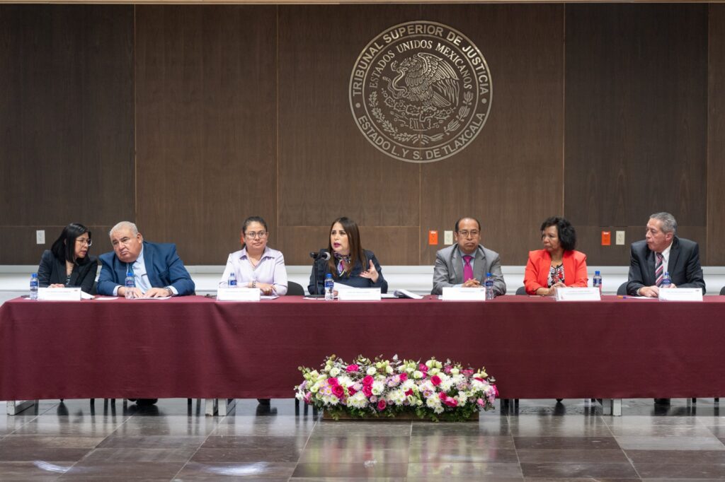 La magistrada Anel Bañuelos Meneses junto con los integrantes del Consejo de la Judicatura del Estado de Tlaxcala y el encargado del Departamento de Servicios Periciales del Poder Judicial de Tlaxcala, Joaquín Téllez Vargas, sostuvo una mesa de trabajo con los 68 nuevos peritos que ya forman parte del padrón del Tribunal Superior de Justicia del Estado (TSJE), a quienes se les brindó una orientación de los servicios que brindarán.