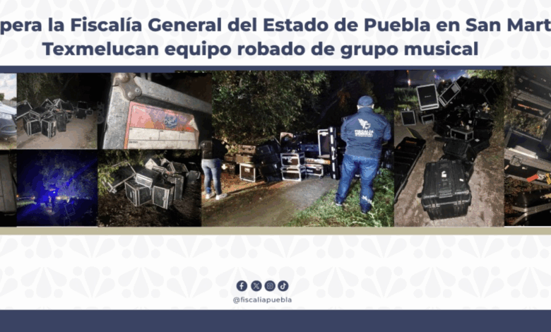 Como resultado de labores de inteligencia, la Fiscalía General del Estado de Puebla recuperó en la comunidad de San Rafael Tlanalapan, perteneciente al municipio de San Martín Texmelucan, instrumentos y equipo de audio propiedad de una agrupación musical, reportados como robados en Ixtapaluca, Estado de México, cuyo valor aproximado es de 8 millones de pesos.
