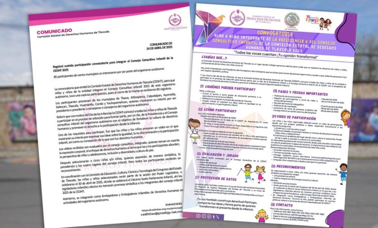La convocatoria que emitió la Comisión Estatal de Derechos Humanos de Tlaxcala (CEDHT), para que niñas y niños de la entidad integren el Consejo Consultivo Infantil 2025 de este organismo autónomo, tuvo una copiosa participación, pues al cierre de la misma se recibieron 85 registros.
