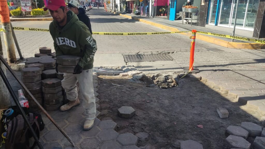 Repara Ayuntamiento de Amaxac falla en drenaje de calle Vicente Guerrero que había generado socavón