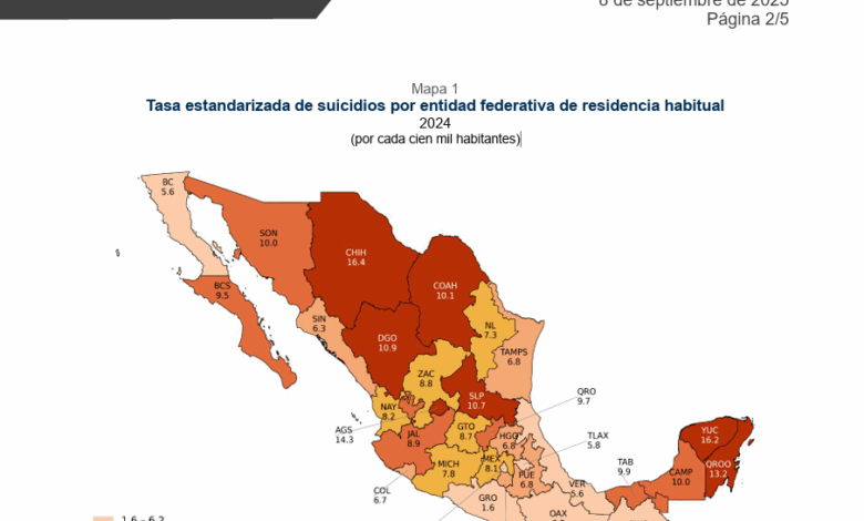 Las entidades con las mayores tasas de suicidio fueron en Chihuahua (16.4), Yucatán (16.2) y Aguascalientes (14.3).