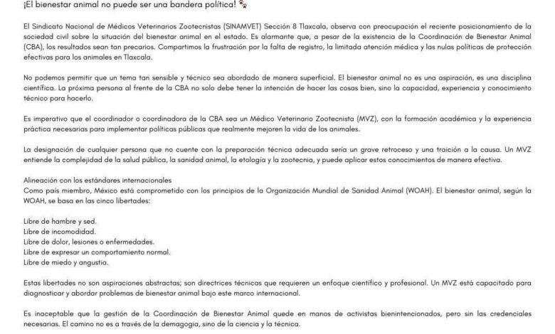 En un posicionamiento público, el sindicato criticó la falta de registros, la atención médica limitada y las “nulas políticas efectivas” para proteger a los animales en Tlaxcala, a pesar de la existencia de la CBA. Subrayaron que el bienestar animal “no es una bandera política ni una aspiración, sino una disciplina científica que requiere conocimientos especializados”.