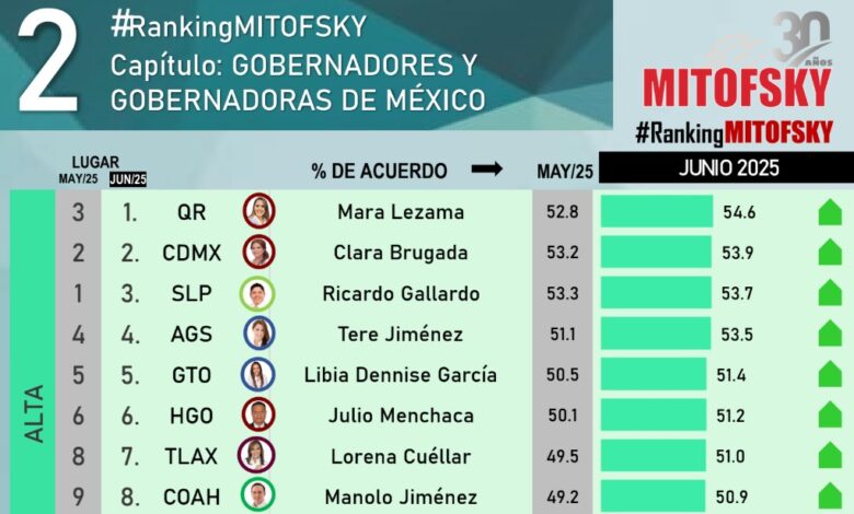 En junio, la medición a cargo de Consulta Mitofsky para El Economista muestra que los mandatarios que mejor califica la ciudadanía son: Mara Lezama, de Quintana Roo (54.6%), Clara Brugada, de la Ciudad de México (53.9%); Ricardo Gallardo, de San Luis Potosí (53.7%); Tere Jiménez, de Aguascalientes (53.5%); Libia Dennise García, de Guanajuato (51.4%); Julio Menchaca, de Hidalgo (51.2%) y Lorena Cuéllar, de Tlaxcala.