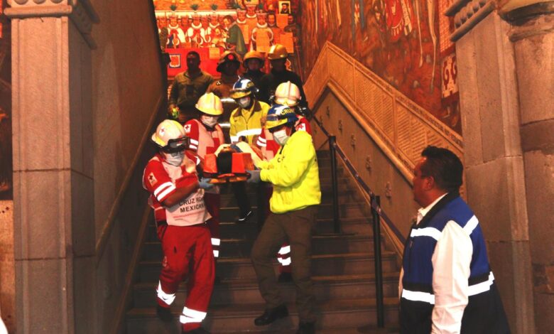 De acuerdo con el parte oficial, fueron evacuadas 98 personas de Palacio de Gobierno, en 2 minutos 13 segundos. Además, se atendió a una persona que supuestamente sufrió una lesión de rodilla por parte del personal de Cruz Roja y del CRUMT, reportó el titular de la CEPC, Juvencio Nieto Galicia.