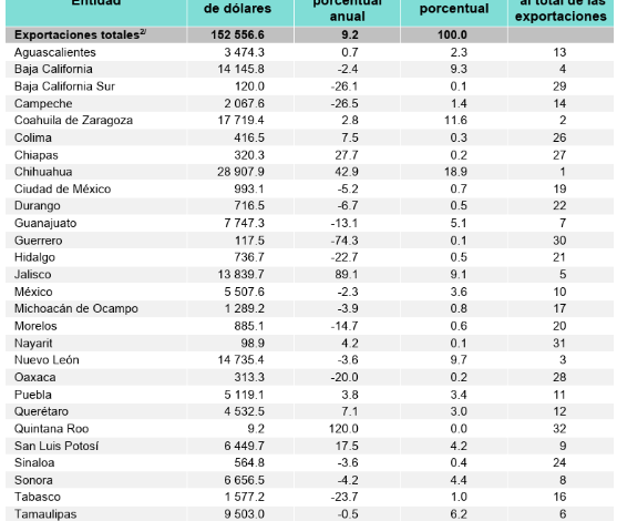 Destacó la participación de Chihuahua, con 18.9 % del total de las exportaciones; Coahuila, con 11.6 %; Nuevo León, 9.7 %; Baja California, 9.3 %; Jalisco, 9.1 %; y Tamaulipas, con 6.2 por ciento. En conjunto, aportaron 64.8 por ciento.
